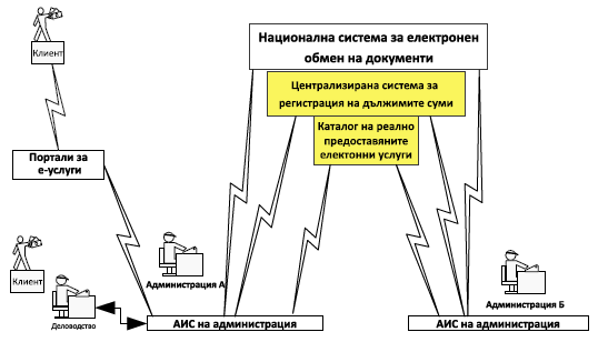 пи електронния документооборот.Към момента повече от 150 администрации имат възможността да си обменят електронни документи помежду си. Това не стана без помощта на самите администрации, които имат много точно чувство за „полезността” или за „безполезността” на всеки предложен „от горе” ИКТ проект. Това стана и със сaмooтвержената работа на млади и компетентни специалисти от ДАЕУ. На практика, с решението за реализация на електронен обмен на документи /ЕОД/, ДАЕУ реализира оперативна и семантична съвместимост на всички съвременни български документооборотни системи. Само въпрос на технологично време е всички администрации да се включат в обмена на документи. Това, обаче, не е достатъчно, защото администрациите не си пишат „просто така”. Те не си разменят документи по електронен път „за удоволствие” или за да отчитат дейност. Администрациите са създадени за да извършват услуги, а голяма част от тях са свързани с подаването на заявления, съдържащи слабо структурирана информация (заявление за административна услуга и приложения към него). В резултат много често се създавант документи със същата структура. Към момента повече от 80% от административните услуги се отнасят към тази категория. Въвеждането на решение, което да позволи да се заявяват и да получават по електронен път административни услуги, днес и сега, без да се чака регистрите "да започнат да си говорят говорят“ е важна и актуална задача, която може да бъде решена чрез три прости за изпълнение и ефективни стъпки:
