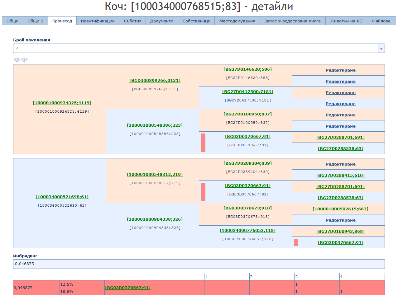 - графична визуализация на родословието с изчислен инбридинг;