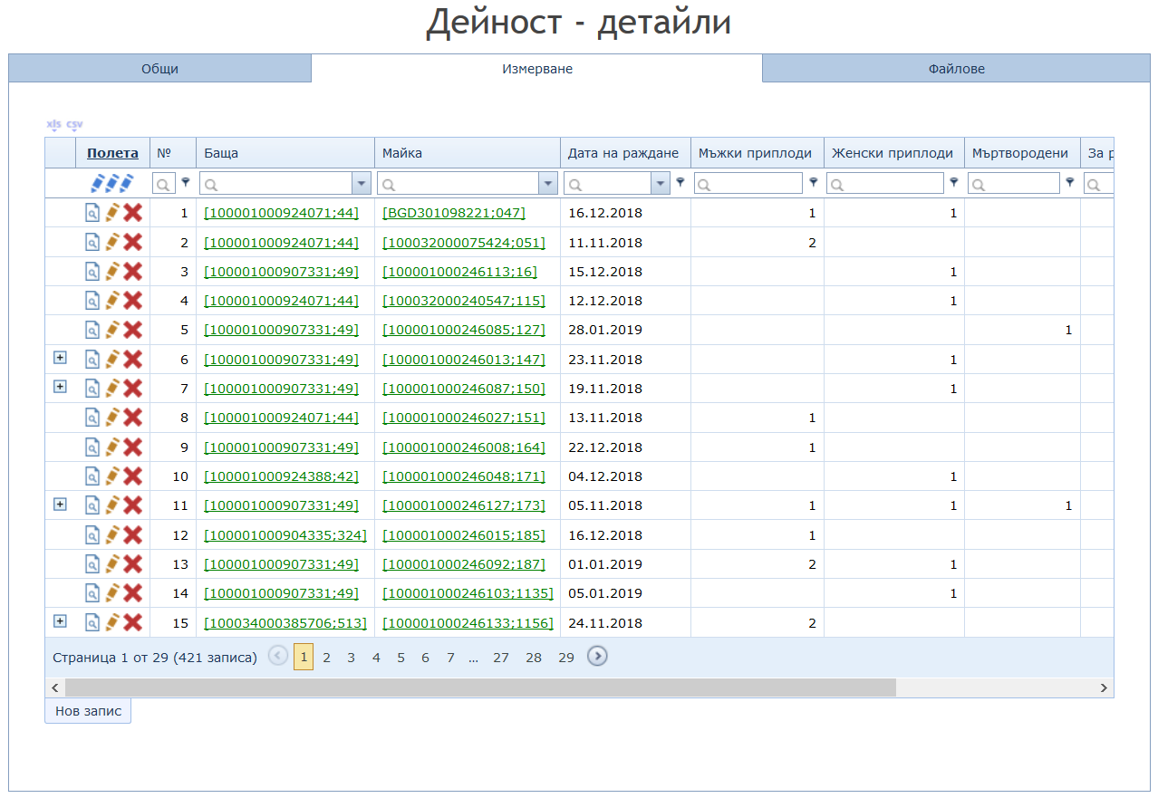 - „Статистика на разплода“ по мъжки и женски животни;