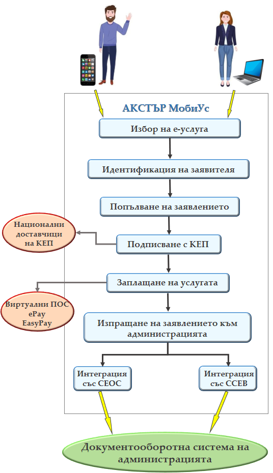 Системата АКСТЪР МобиУс© е нов и иновативен продукт, който позволява на всеки гражданин или фирма, само с няколко кликвания, да заяви административната услуга като използва мобилно приложение на своя смартфон или web браузър на своя компютър. Направената заявка за електронна административна услуга се подава директно към документооборотната система на общината за регистрация и последваща обработка.